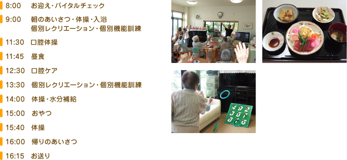 利用者様が、ご自宅で生活を送れるように、入浴・食事・機能訓練を日帰りで行うサービスです。また、様々なレクリエーション等で体を動かしたり、たくさんの方と交流する機会が増えるので閉じこもりがちな方の孤立感を解消したり、心身機能の維持ができ、介護者様にとっても日中自分の時間ができ、介護負担の軽減にもつながります。
